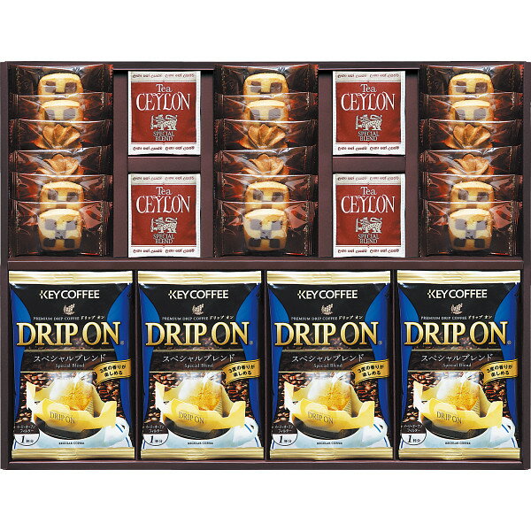 ギフト対応●キーコーヒードリップオン8g×16・アソートクッキー×18・セイロン紅茶2.3g×12 ・ハコ約41.5cm×32cm×5.5cm・重量=約700g ●アレルゲン【卵・乳・小麦】●化粧箱入※のし包装(ラッピング)はひとつずつ無料で致します。